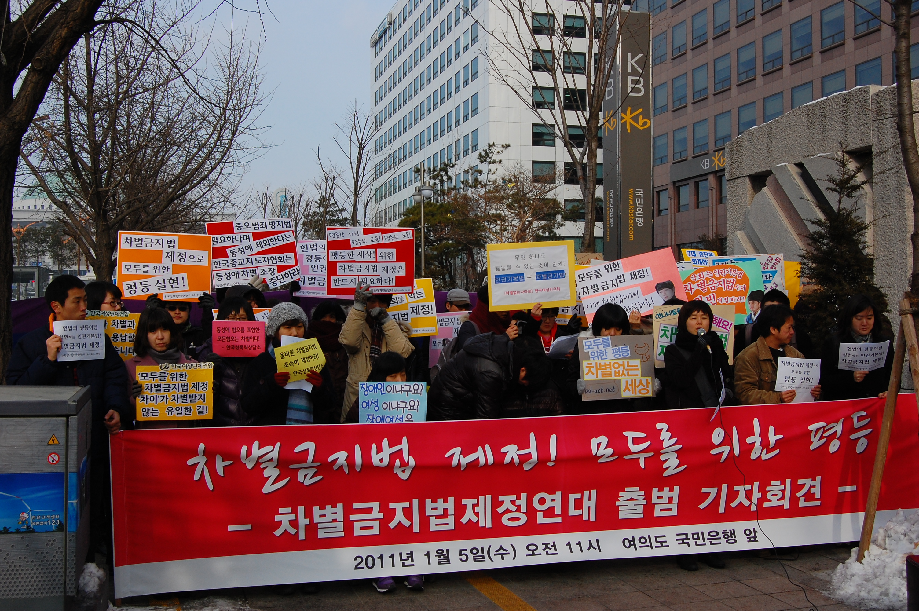 2011년 1월 5일(수) 오전 11시 여의도 국민은행 앞서 차별 금지법 제정을 취지로 하는 ‘차별금지법제정연대’의 출범 기자회견이 열렸다. 3년 넘게 끌어온 차별금지법 제정을 실현하고 우리사회의 보수화와 인권 후퇴를 막고자 사회적 소수자들을 대표하는 34개 단체들이 연합해 차별금지법제정연대를 출범하고 활동계획을 밝혔다.